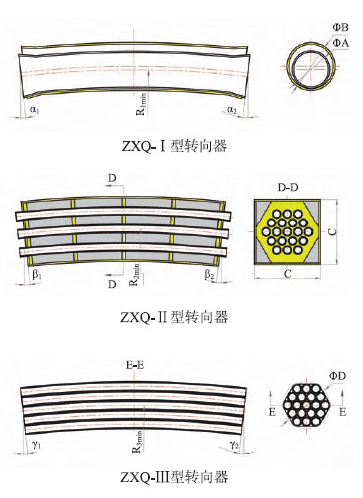 ZXQ-Ⅲ型轉(zhuǎn)向器為鋼管組焊式分絲管轉(zhuǎn)向器,由多根小鋼管組焊而成,鋼絞線各自平行獨(dú)立穿過各小鋼管,使鋼絞線受力均勻,可以單根換索。其截面比ZXQ-Ⅱ型轉(zhuǎn)向器小,能適用于結(jié)構(gòu)緊湊的場合中。